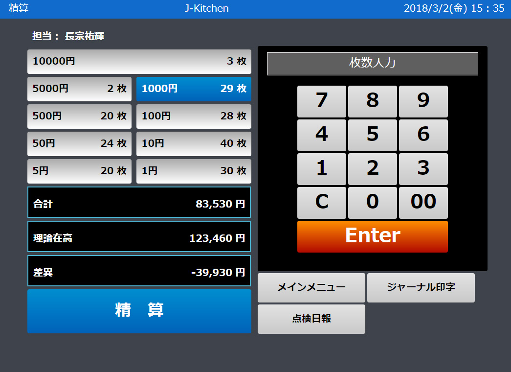 現金を数えて入力するだけで、過不足の発生などがわかる。その情報は売上集計データに記載されるため、不正防止にもつながります。