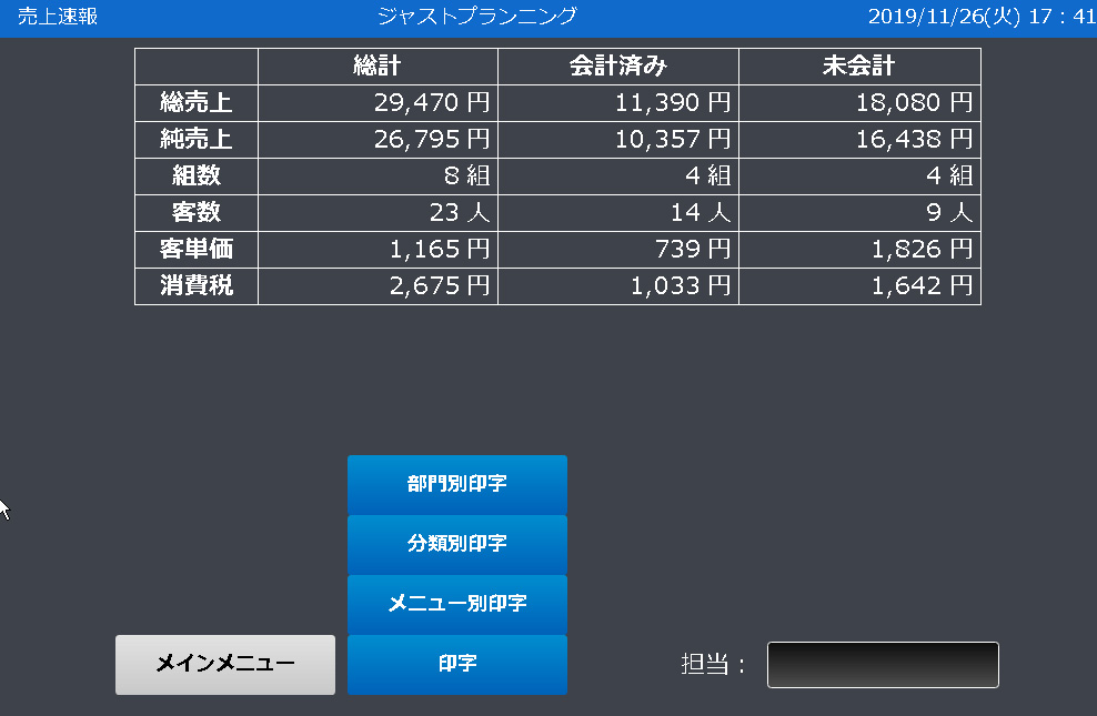 1日の業務を終了し、金種確認と精算レポートを印字します。(自動釣銭機内の金額の取得可能)